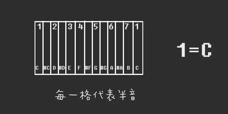 But scales aren’t limited to “1 2 3 4 5 6 7”. Pleasant pitch sets are countless. The Chinese-sounding “pentatonic scale” is “1 2 3 5 6”. Try clicking these notes at will C4D4E4G4A4C5—whatever random clicks still feel “Chinese”. Different places and eras breed different scales, each with a unique flavor: the pentatonic sounds grand and open, while the Japanese pentatonic sounds dark and winding C4Db4F4G4Ab4C5. Many more scales exist—minor, Phrygian, Dorian, etc.—but the major scale “1 2 3 4 5 6 7” is the most widespread and versatile, so it’s our default.